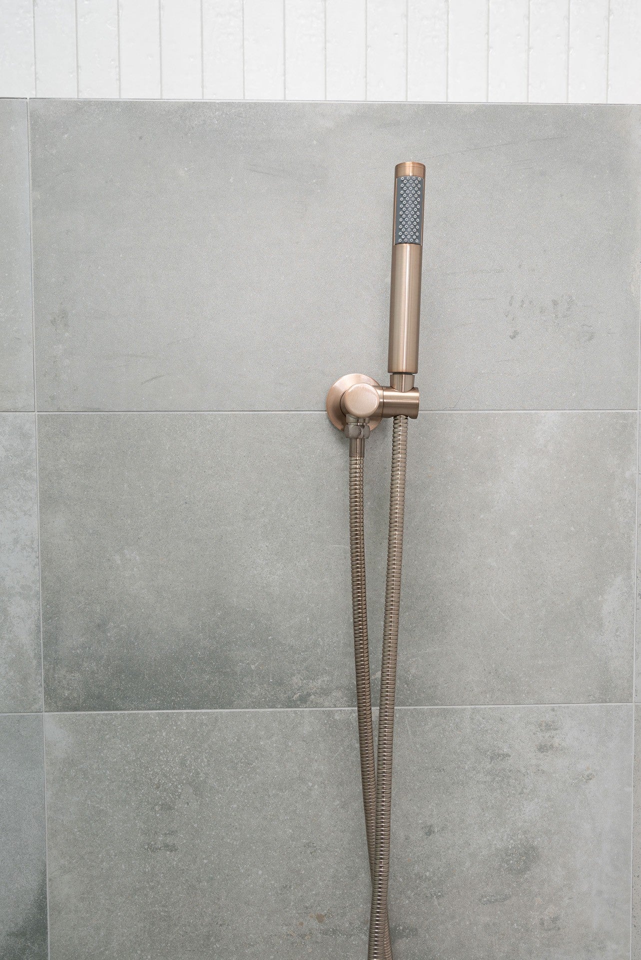 De rosé gouden badset met rond design is een stijlvolle toevoeging voor bij je inbouw of vrijstaand bad. De gebogen wanduitloop en handdouche zijn gecombineerd met een mengkraan inclusief omstelknop en rozet. De mengkraan is op zo’n manier vormgegeven dat je slechts met deze ene hendel zowel de temperatuur als de sterkte van de waterstraal kunt inregelen. Met behulp van de omstelknop kun je eenvoudig wisselen tussen de uitloop- en handdouche. De uitvoering van de handdouche betreft een staaf model en heeft een doucheslang van 1,5 m lang.